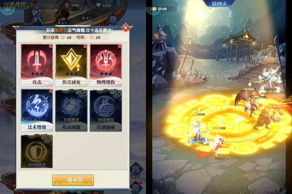 除此之外,游戏主打轻松护肝体验,解锁真一键升级功能,所有英雄等级共享,无需繁琐回退资源,搭配自动爬塔、后台推图、智能合成等便捷功能,让玩家随时打开、随时放下,真正实现轻松游戏[2];更有位面晋升、红钻矿洞、装备精炼、法宝合成等丰富玩法,英雄达到100级后可开启神话大世界,多人同屏自由探索、搜集材料打造专属灵宝,上百个随机词条让灵宝独一无二[2];跨服竞技场每周开启,支持押注神魔抽卡券,兼顾竞技乐趣与福利获取[2]。